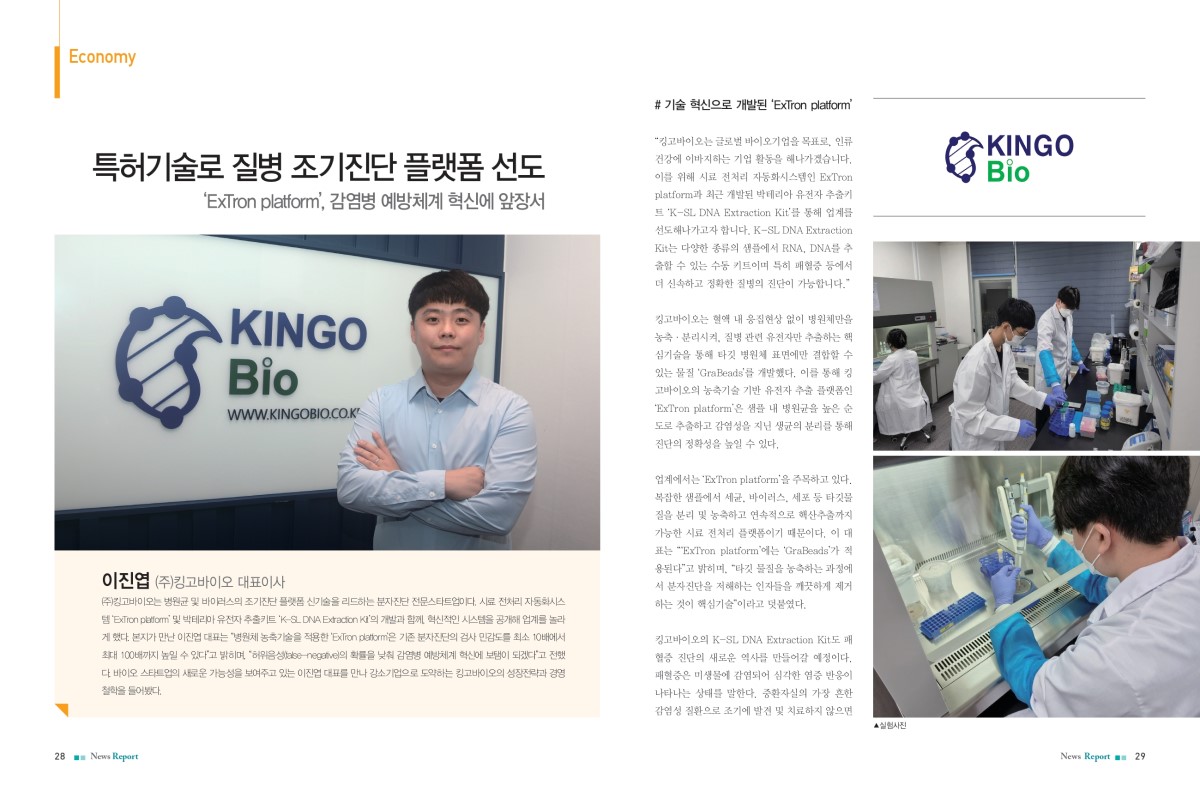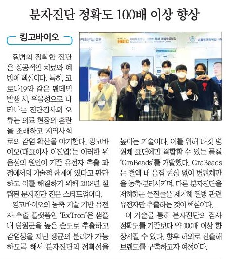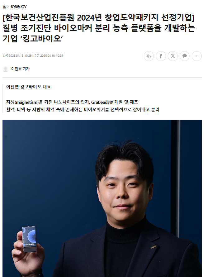 2025-05-27![[한국보건산업진흥원 2024년 창업도약패키지 선정기업] 질병 조기진단 바이오마커 분리 농축 플랫폼을 개발하는 기업 '킹고바이오'](/img/press/media-84.png)