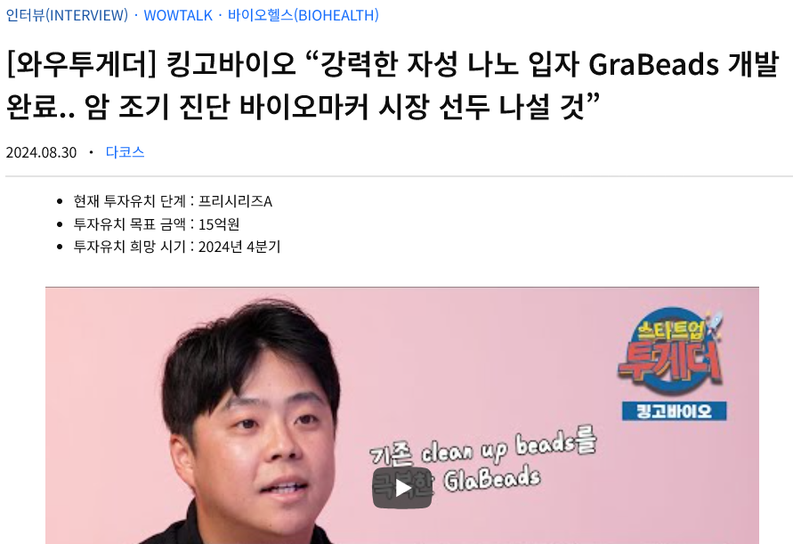 [와우투게더] 킹고바이오 "강력한 자성 나노 입자 GraBeads 개발 완료.. 암 조기 진단 바이오마커 시장 선두 나설 것"